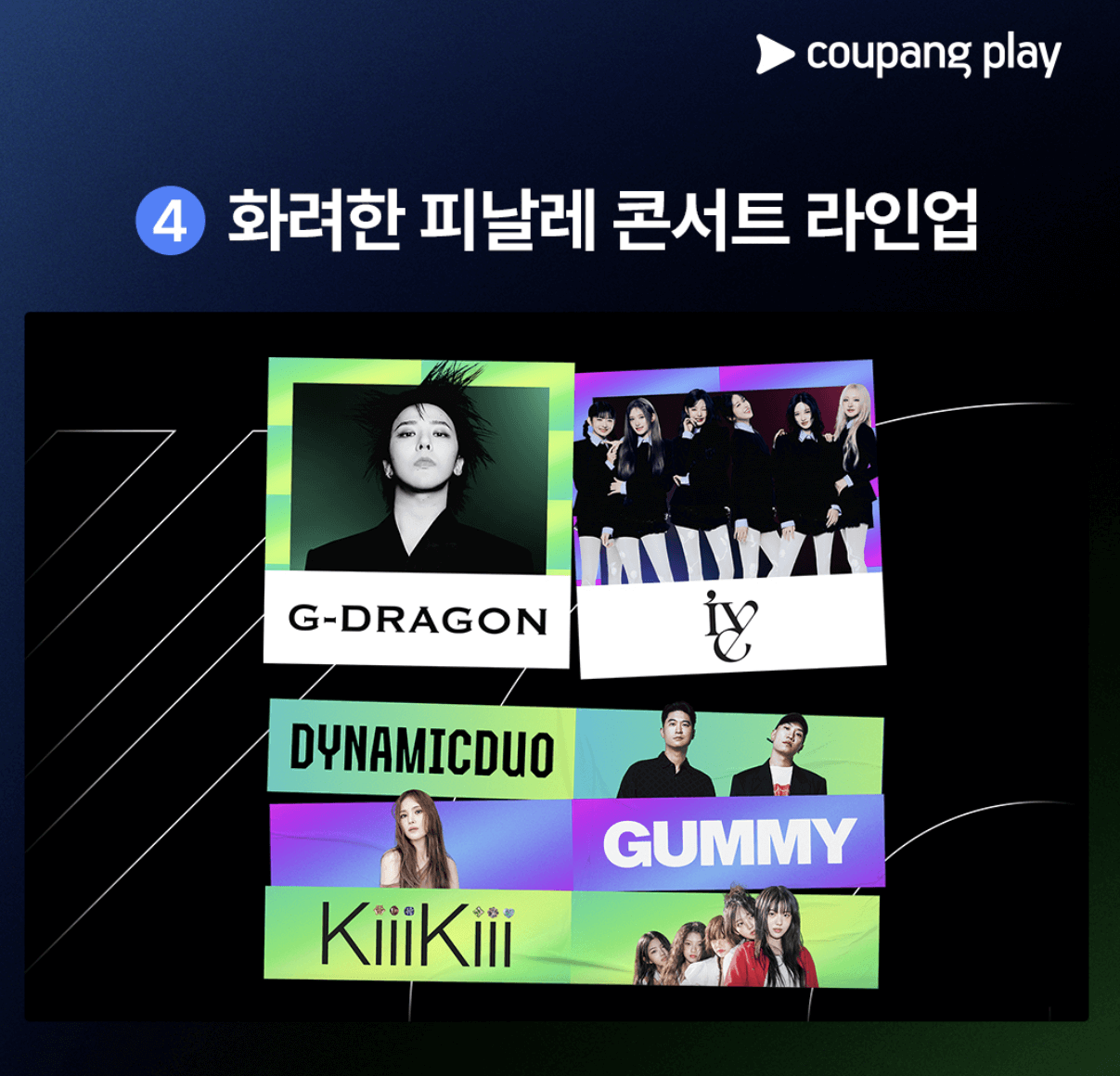 골프 축제의 피날레로 연말 시상식급 콘서트가 장식한다. 파이널라운드 직후 펼쳐지는 ‘LIV 골프 코리아 콘서트 with 쿠팡플레이’는 지드래곤(G-DRAGON), 아이브(IVE), 다이나믹 듀오, 거미, 신예 걸그룹 키키(KiiiKiii)까지, 뮤직 페스티벌을 방불케하는 라인업으로 구성됐다.