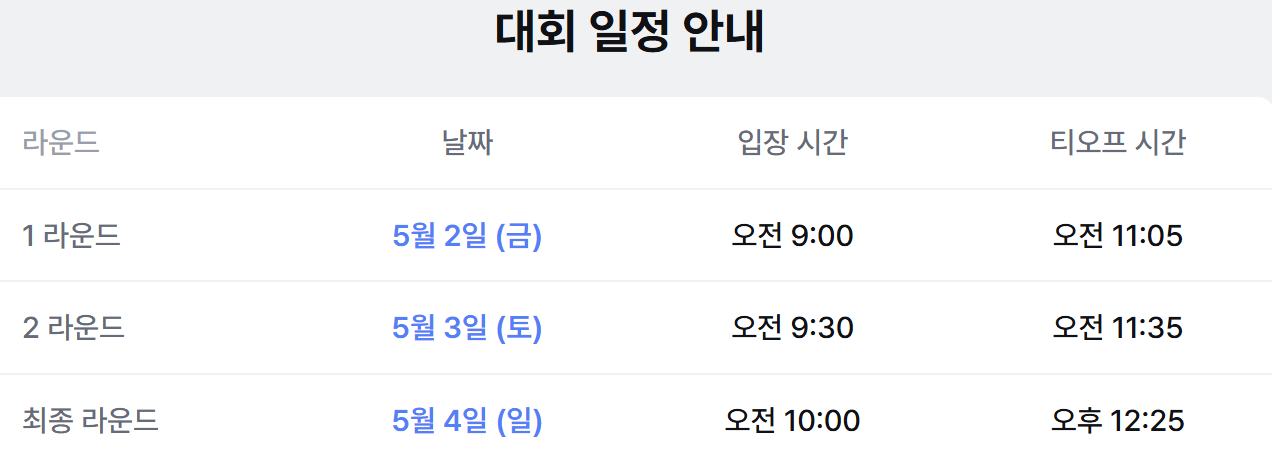 1일차부터 3라운드까지 하루 한 라운드로 구성되며, 경기 시간은 오전 10시부터 오후 4시까지로 예정되어 있습니다.